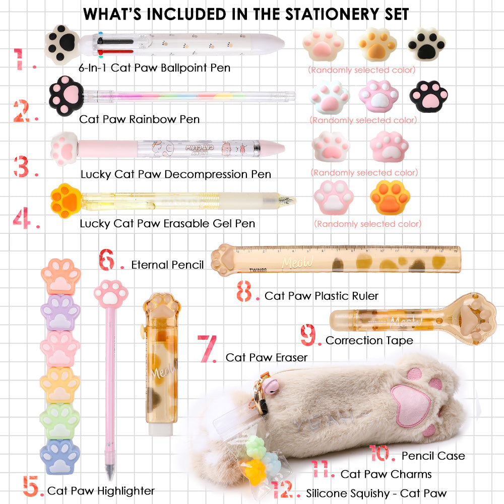 Get ready to paws-itively fall in love with Vin2Love Kitty Paws Stationery Set! This purrfectly adorable collection is designed for cat lovers who can't resist the charm of feline fun. Each item in this set is crafted with a dash of kitty magic, and this time, we’ve gathered 12 pawsome pieces that will bring the playful spirit of cats right to your desk. From the 6-In-1 Cat Claw Ballpoint Pen to the Lucky Cat Claw Decompression Pen, this set will make your daily tasks more paws-itively fun and utterly adorable.