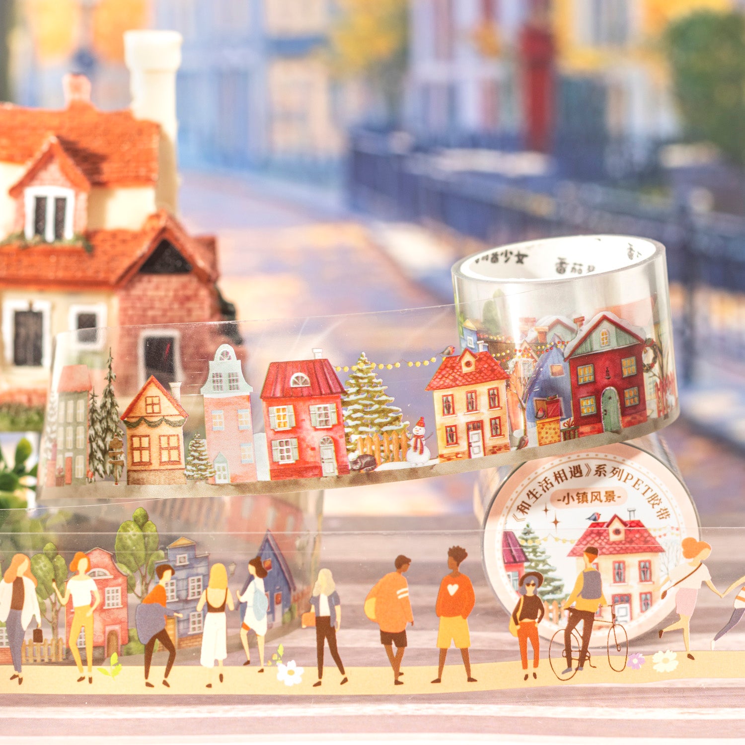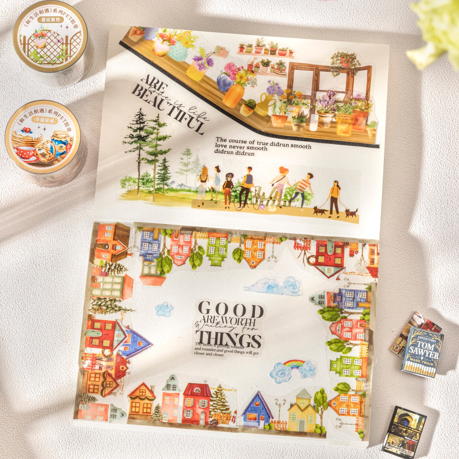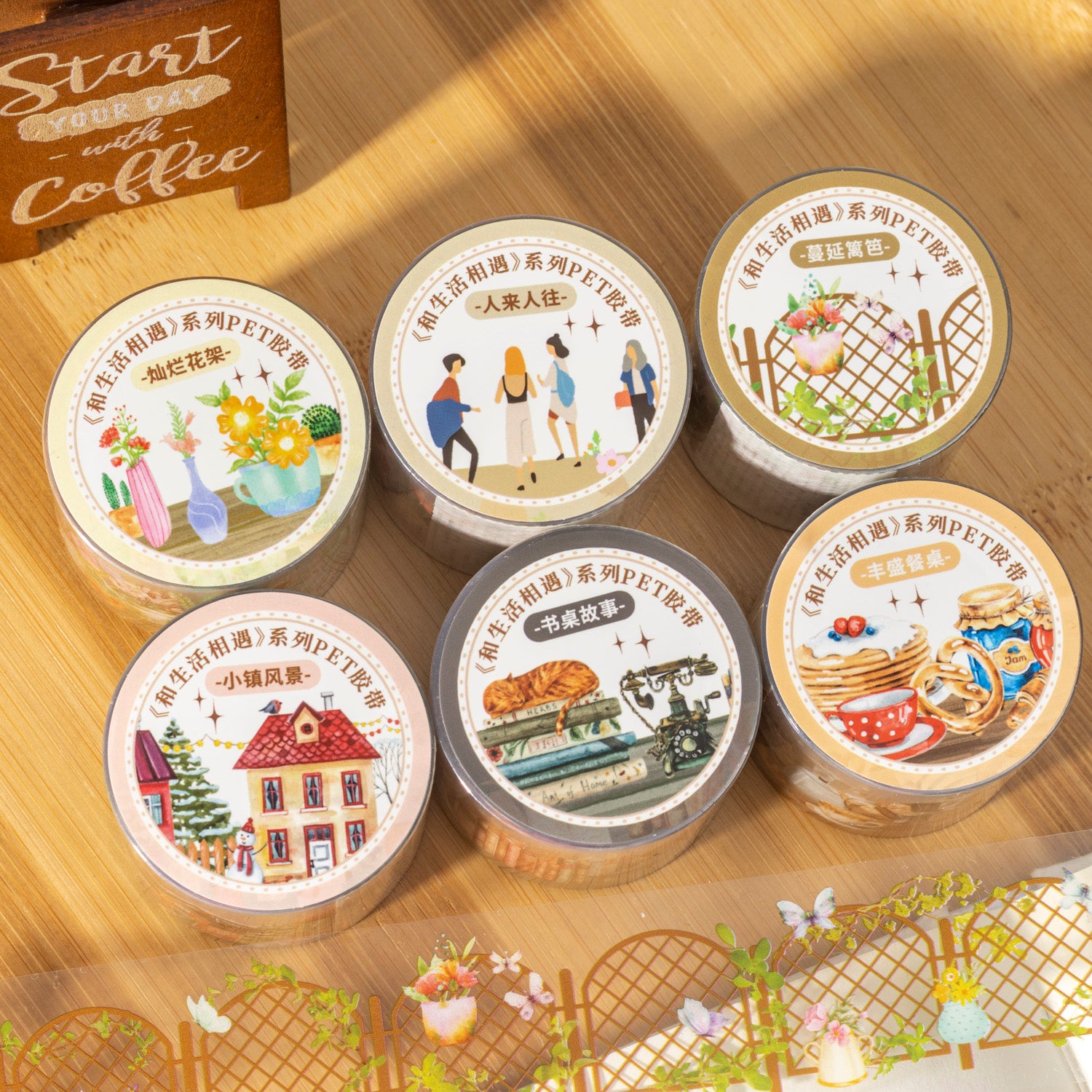 Bring your creative projects to life with the 1 Roll Meet Life PET Tape Set! This charming collection features 6 unique rolls of PET tape, each one showcasing delightful illustrations of everyday life, including houses, people, books, dining tables, flower pots, and more. Perfect for adding a touch of whimsy and storytelling to your journals, scrapbooks, planners, and DIY projects, these tapes are a must-have for anyone who loves to capture the beauty of daily moments.