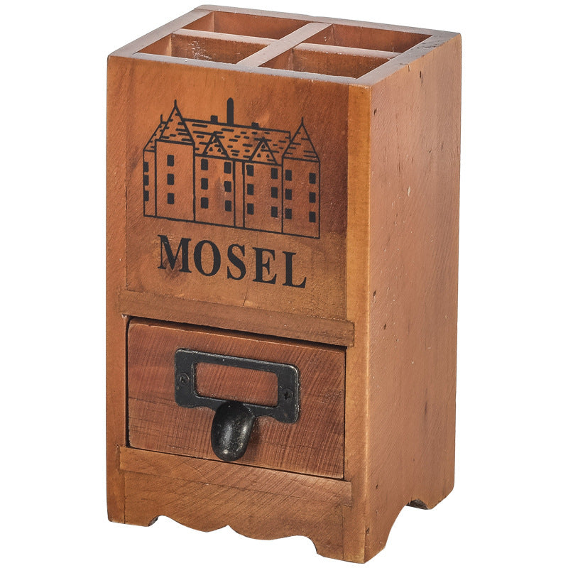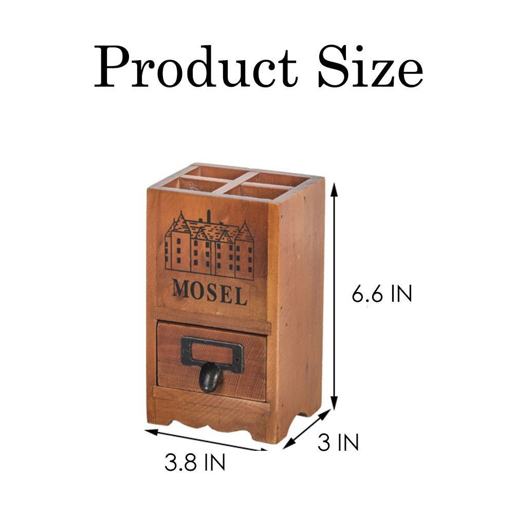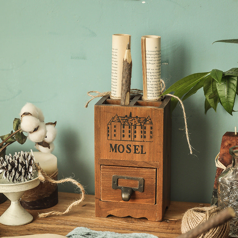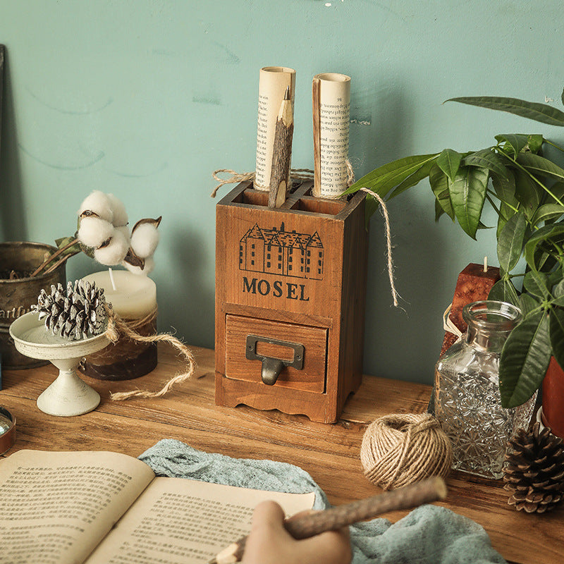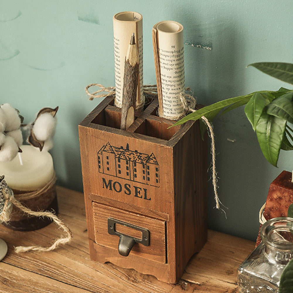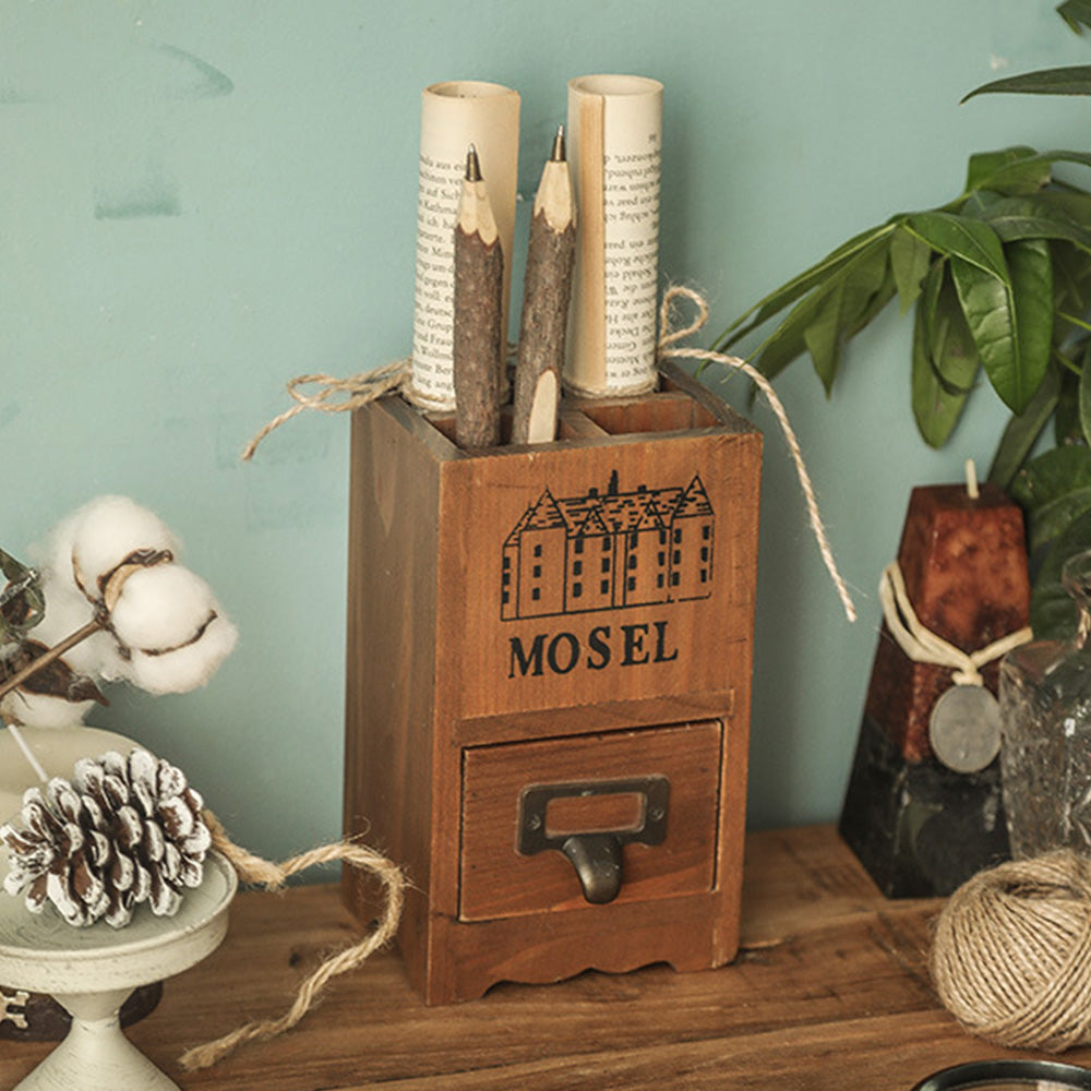 Pot à stylos rétro en bois avec tiroir