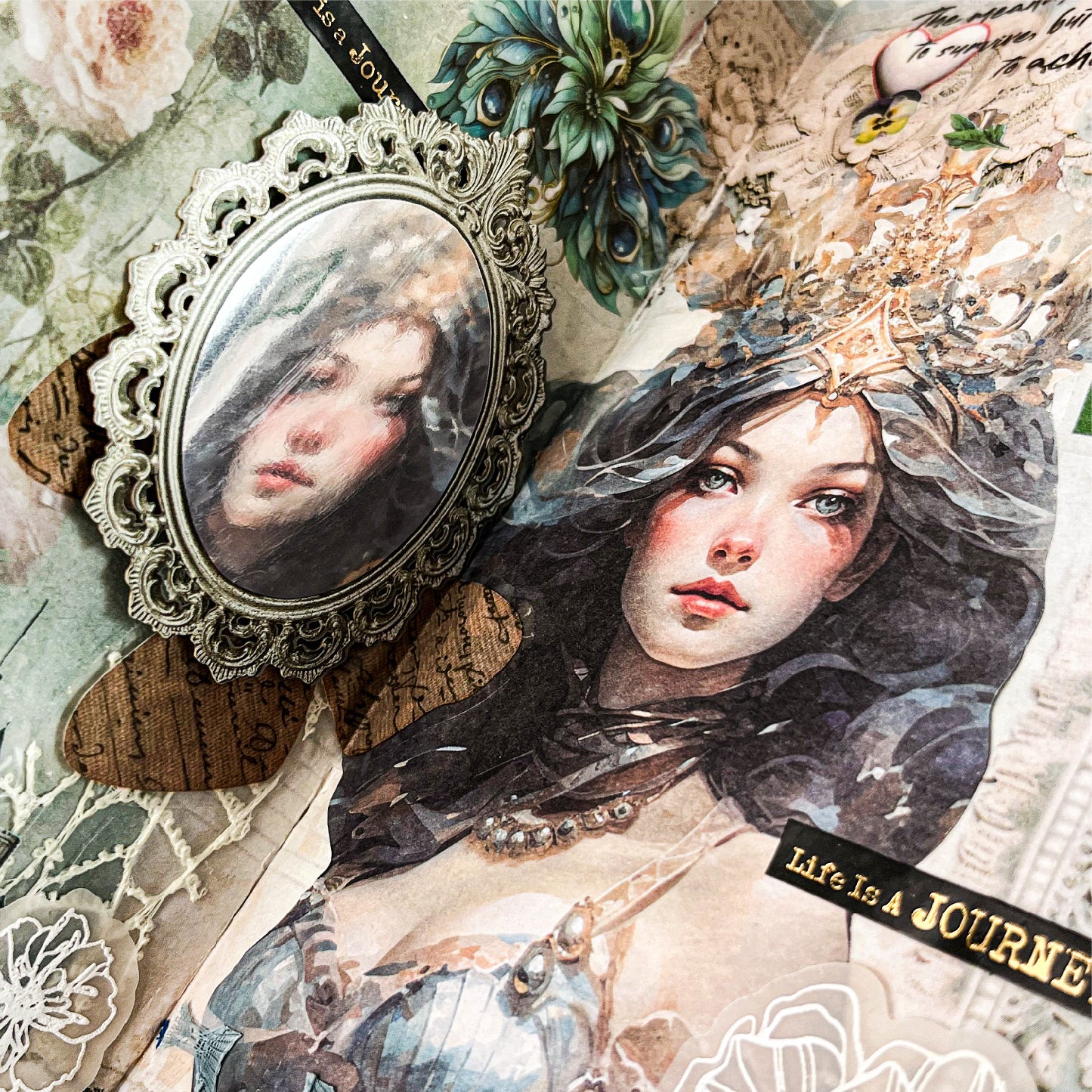 Whether you’re crafting a luxurious scrapbook layout, designing a sophisticated journal spread, or creating a stunning card, these mirror-shaped notes will elevate your work with their regal charm. The reflective silver center adds a unique and eye-catching element, making every project a masterpiece of vintage artistry.