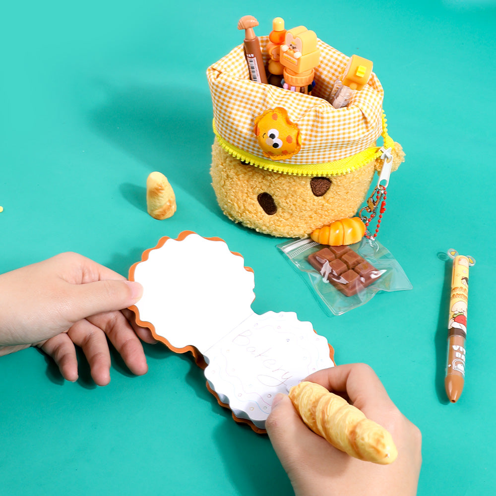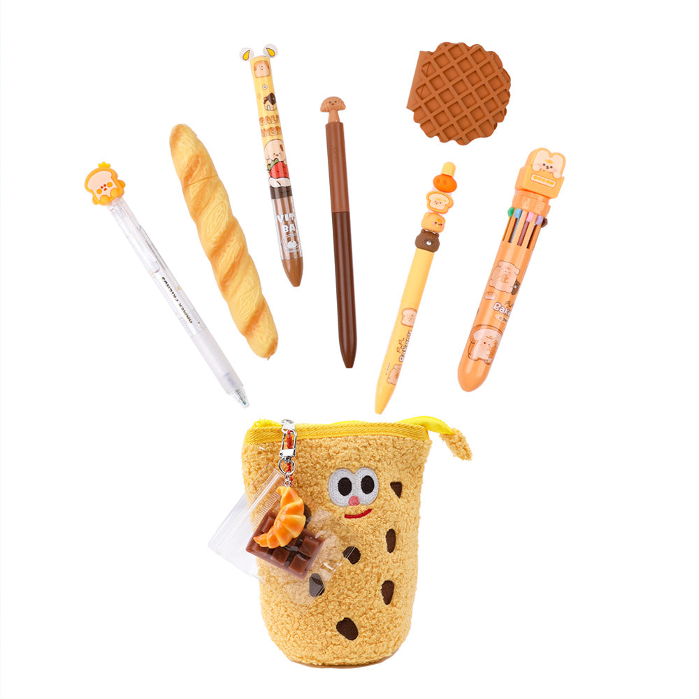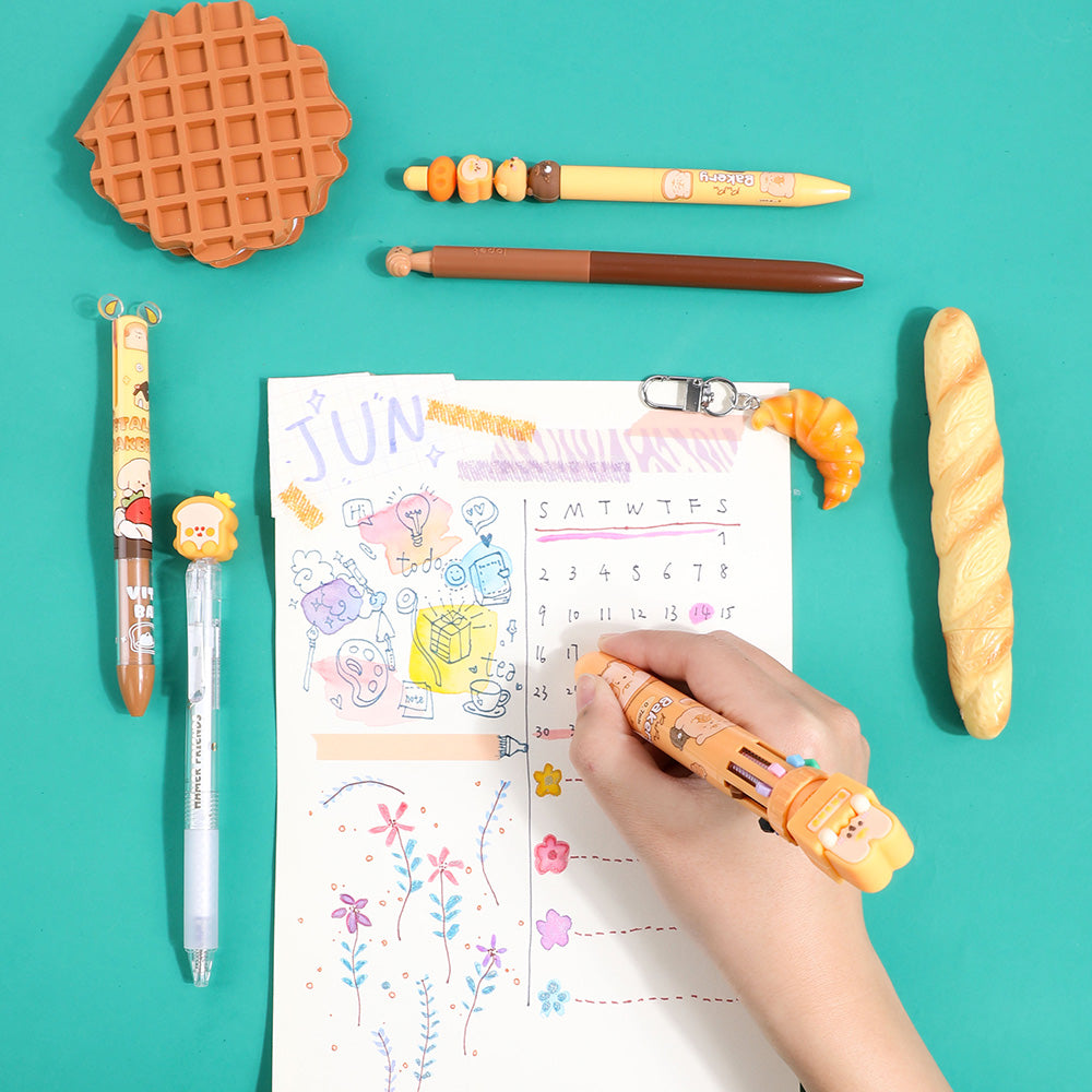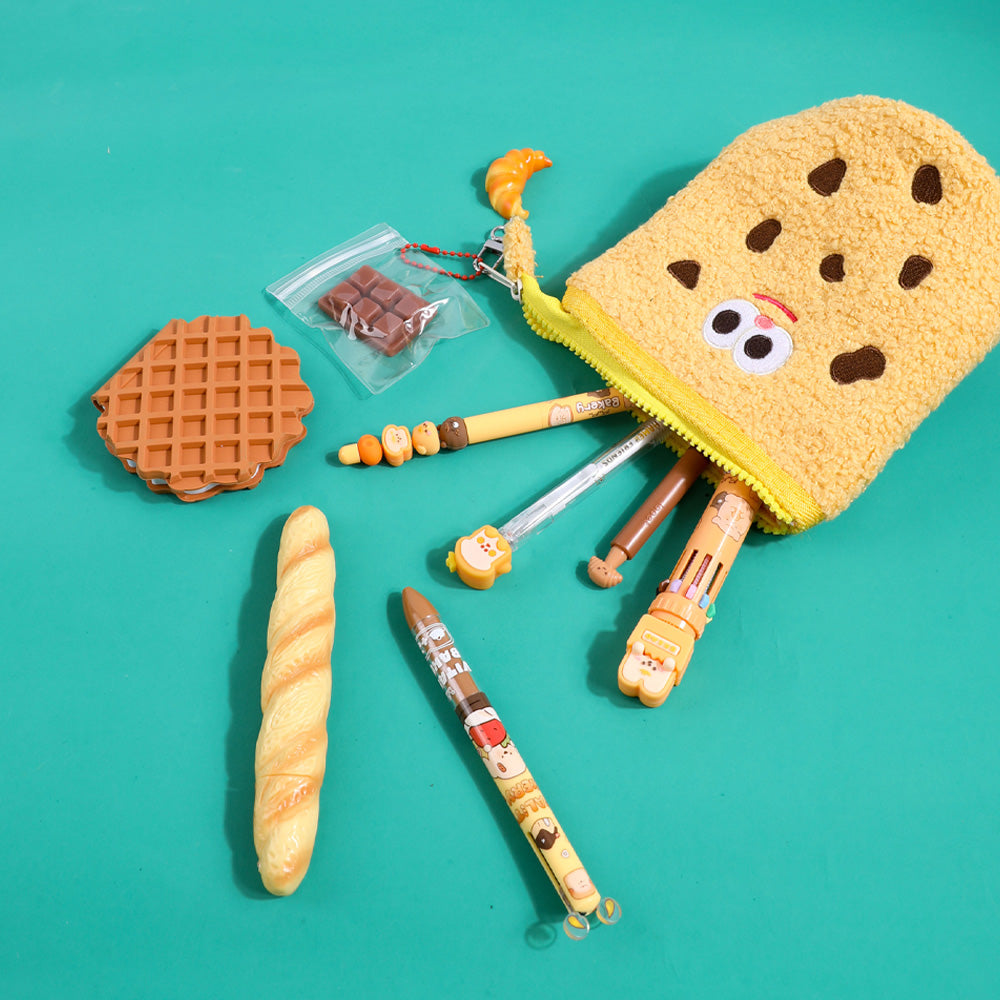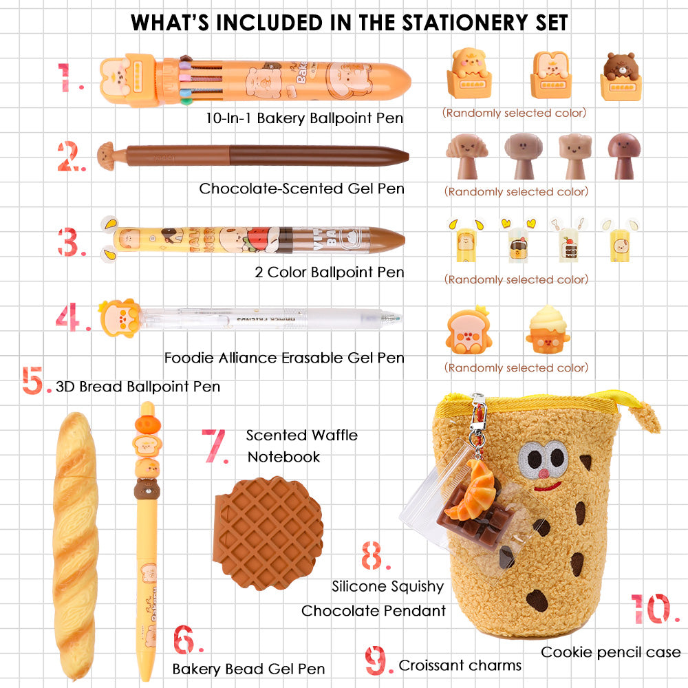 Inside this set, you’ll find 10 carefully curated products, each with its own unique baking-inspired design: a 10-In-1 Bakery Ballpoint Pen, a Foodie Alliance Erasable Gel Pen, a Cookie Pencil Case, a Chocolate-Scented Gel Pen, a 2-Color Ballpoint Pen, a 3D Bread Ballpoint Pen, a Bakery Bead Gel Pen, Scented Waffle Notebook, a Silicone Squishy Chocolate Pendant, and Croissant Charms. Whether you’re journaling, note-taking, highlighting, or simply adding some flair to your desk, this set makes every task more enjoyable.